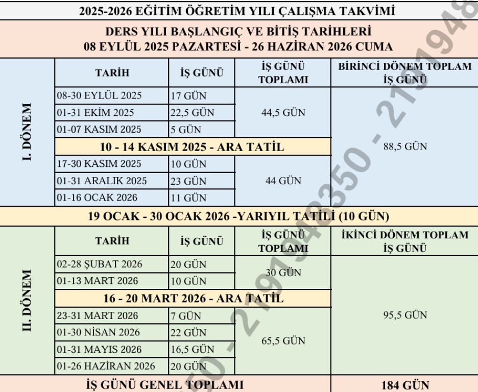 2025 - 2026 EĞİTİM ÖĞRETİM YILI ÇALIŞMA TAKVİMİ